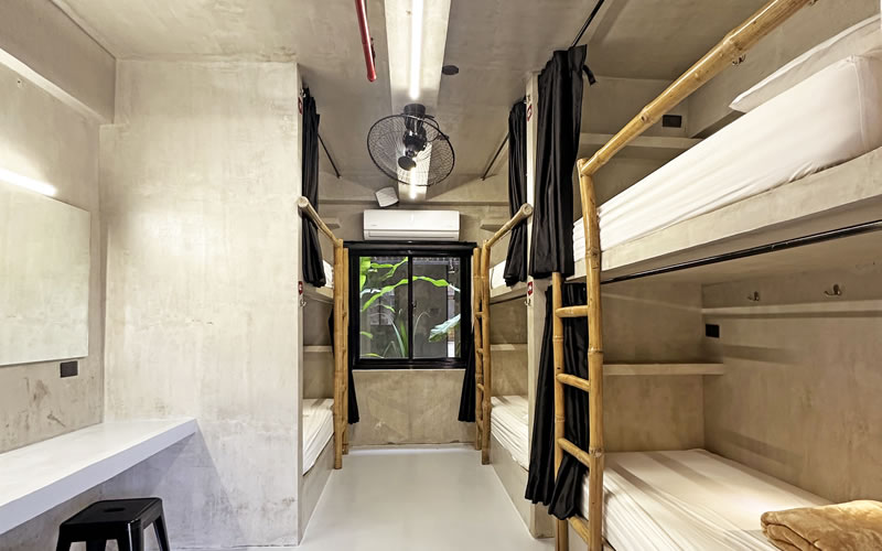 Comfortable dorm shared by 6 -10 guests. Equipped with A/C, privacy curtains, private locker, bedside light and socket.